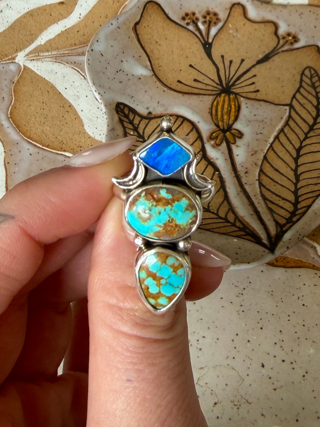 Stunning dark & light blue Australian Opal paired with two #8 Nevada turquoise & two crescent moon. Set in .925 sterling silver
