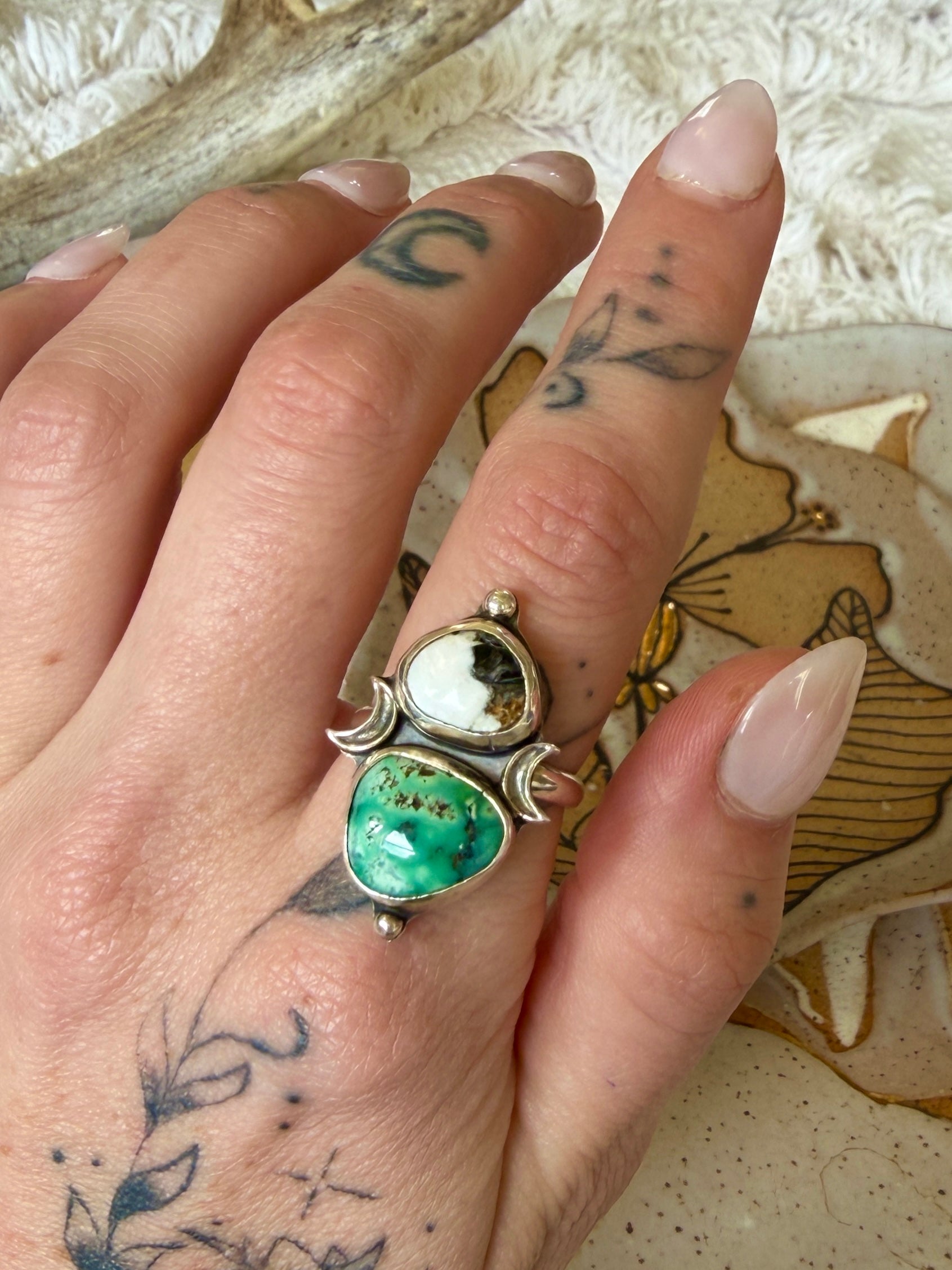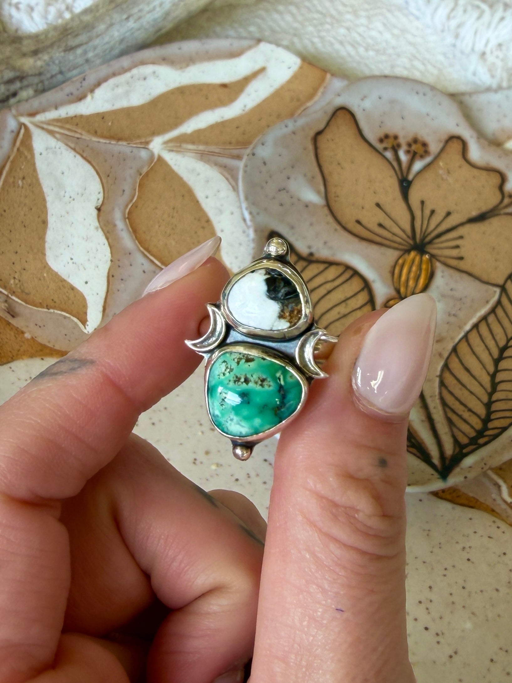 Stunning Nevada white buffalo paired with Nevada Variscite for such a beautiful combo. Paired with two crescent moons & set in .925 sterling silver